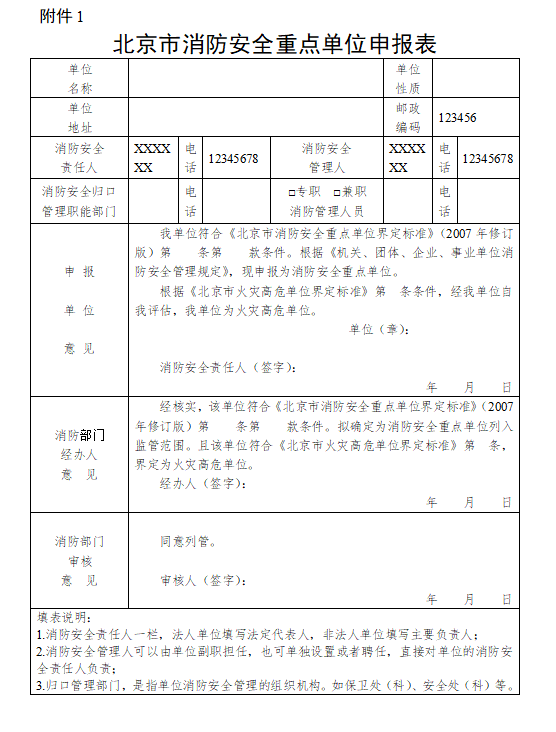 參考《北京市消防安全重點(diǎn)單位界定標(biāo)準(zhǔn)》(附件1)進(jìn)行自評(píng),符合界定標(biāo)準(zhǔn)的填寫《北京市消防安全重點(diǎn)單位申報(bào)表》(附件2)。其中,符合火災(zāi)高危單位界定標(biāo)準(zhǔn)(附件3)的,按照消防安全重點(diǎn)單位備案要求同步申報(bào)。請(qǐng)于申報(bào)時(shí)間內(nèi)將《北京市消防安全重點(diǎn)單位申報(bào)表》及單位身份證明材料復(fù)印件(單位蓋章、消防安全責(zé)任人簽字)報(bào)開(kāi)發(fā)區(qū)消防救援支隊(duì)。