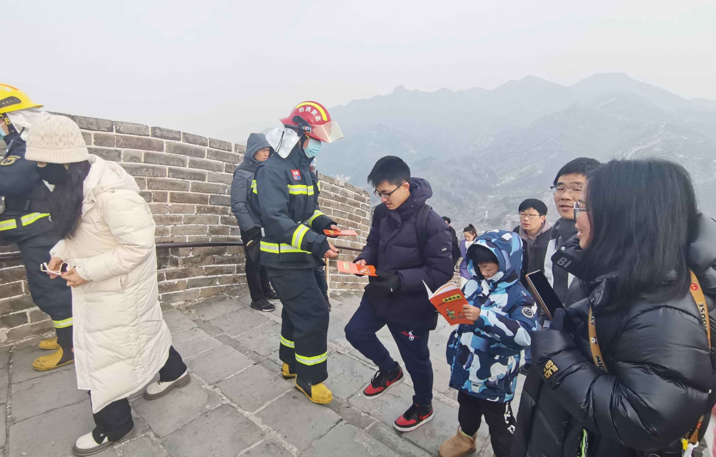 消防宣傳人員在八達(dá)嶺長(zhǎng)城上向游客發(fā)放消防安全宣傳冊(cè)。 圖源:延慶區(qū)消防救援支隊(duì)