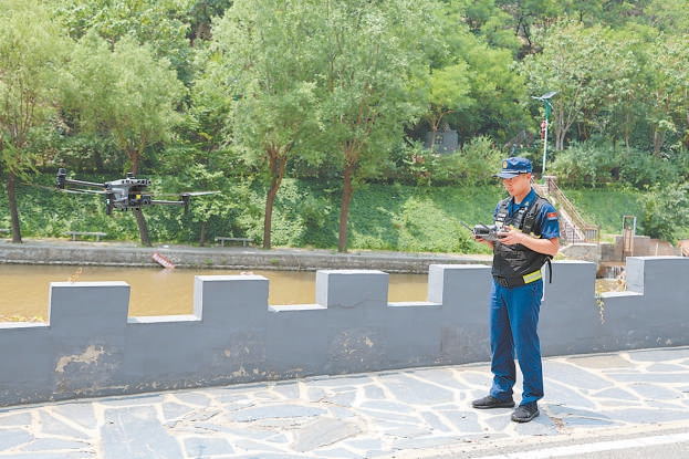 消防救援人員操作無(wú)人機(jī)獲取“受災(zāi)”點(diǎn)位信息。